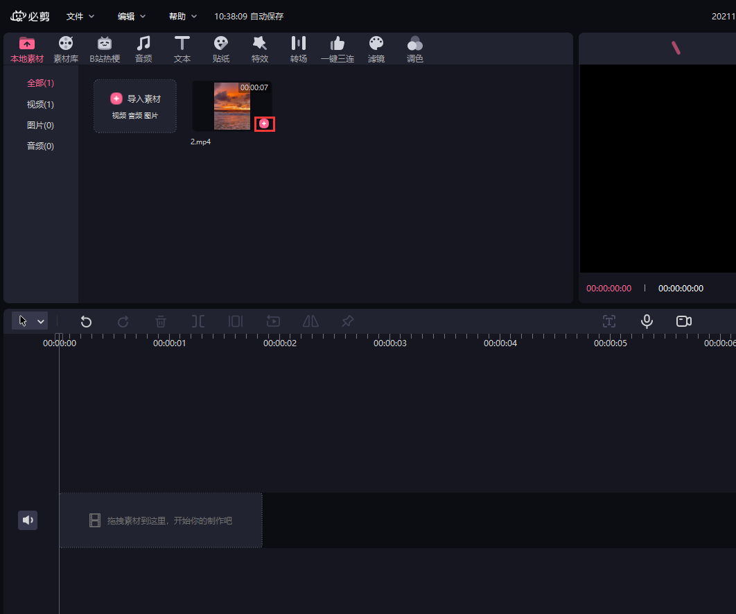 在添加必要的材料后,我们必须点击材料右下角的加号,或将材料直接从材料区拖到轨道区,将其移到编辑轨迹上。