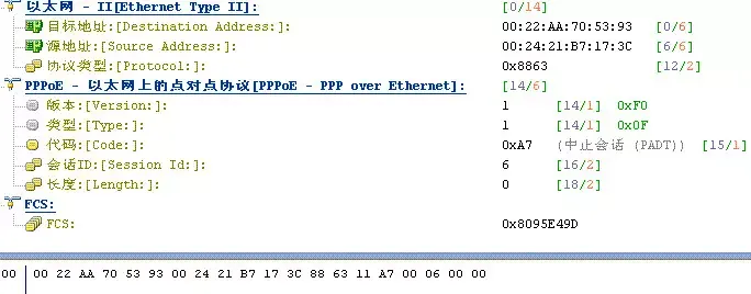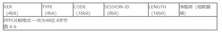PPOE框架格式还包含上述PPOE协议程序两个阶段的两种类型:在发现阶段,Tainet框架中的类型字段为0x8863;在PPA阶段,Taibo框架中的类型字段为0x8864,所有这些都得到IEE的支持。图4-6说明了PPEE框架结构。