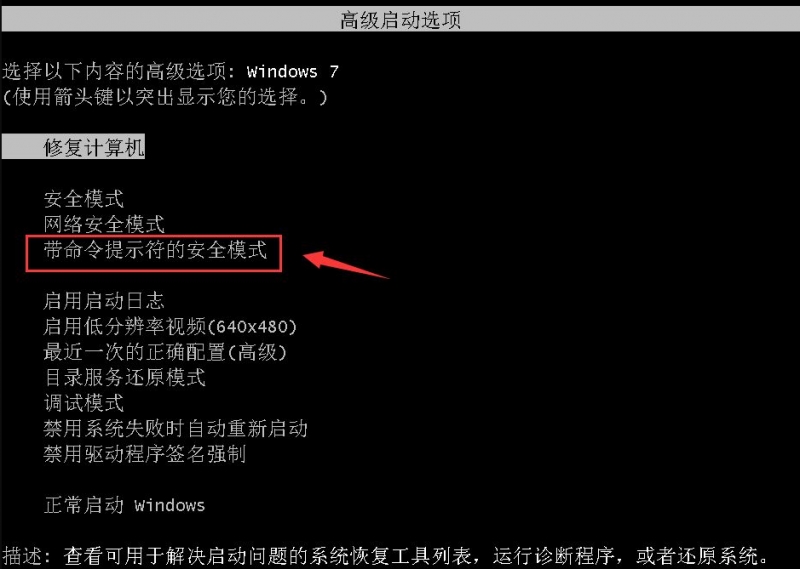 1. 第一台计算机重新启动,然后是致命的F8,直到机器进入屏幕时有一个高启动选项,并选择输入“带有命令提示的安全模式”。