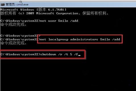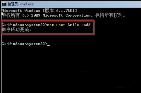 3. 通过运行 NetuserSmil/add并返回弹出式管理员模式中的命令提示对话框,机器中增加了一个新账户。