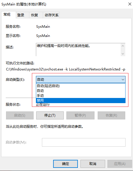 3。打开属性界面,从下拉菜单中选择 [一般],设置 [启动类型]到[禁用],并单击底部[确定]按钮。