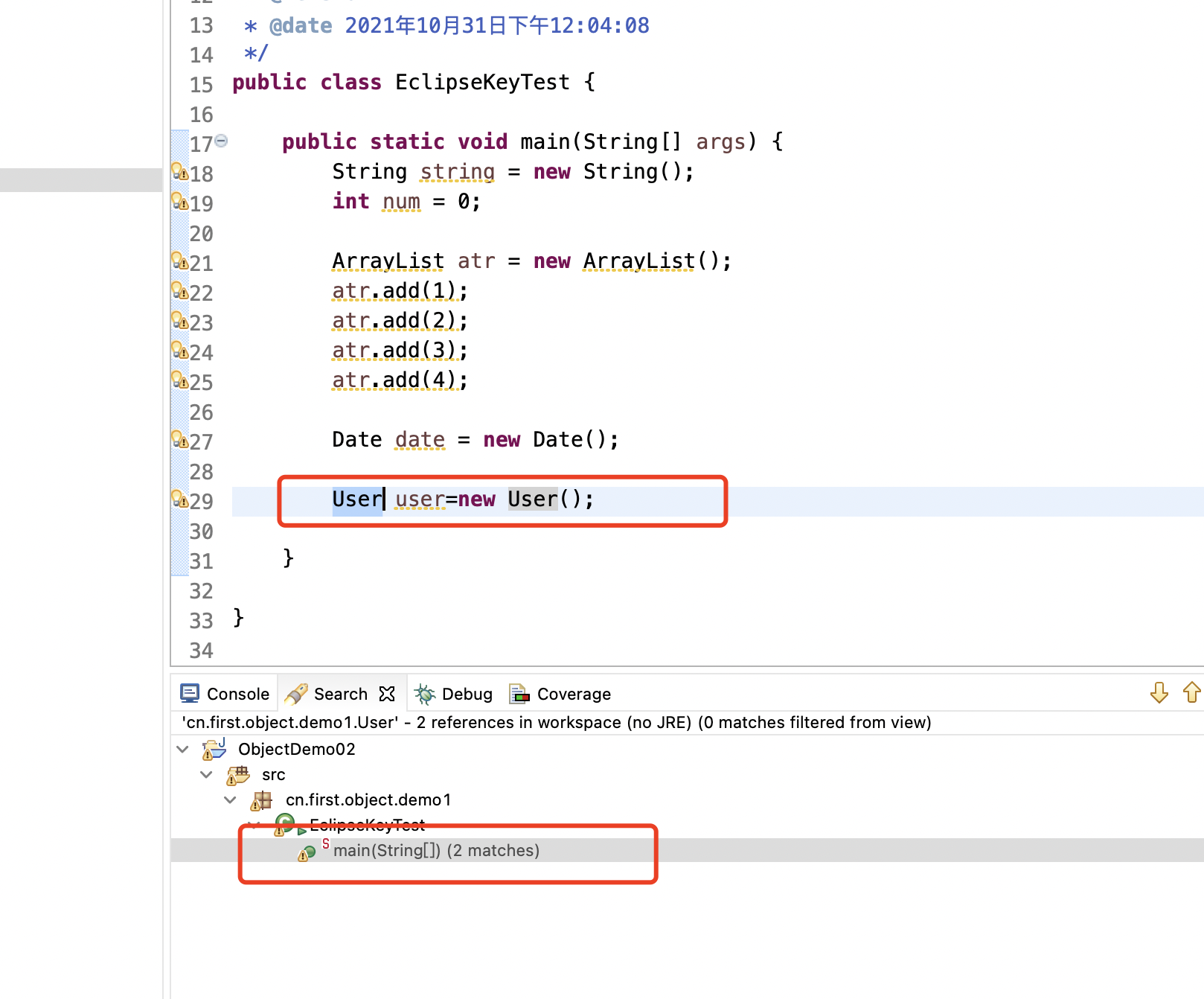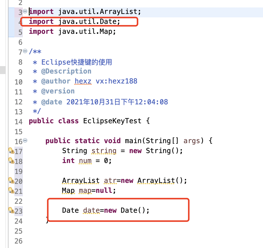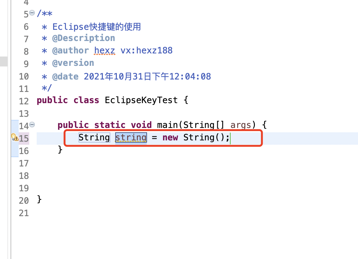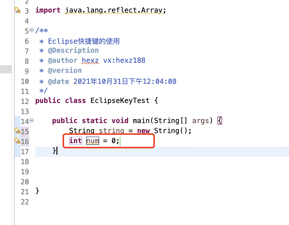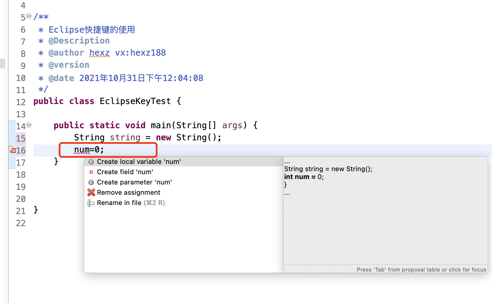 当我们创建对象时, 我们直接进入新闻, 没有提供新的对象变量名称, 我们可以很容易地将光标置于( ) 和( ) 之间, 并使用 ctrl+1 快捷键来修正它 。