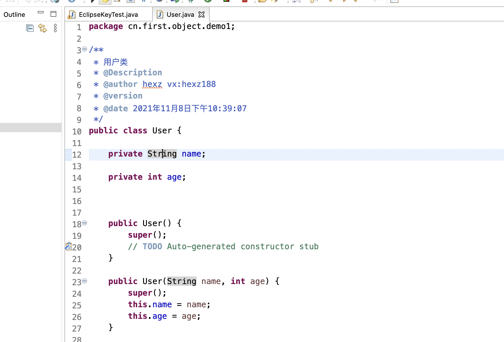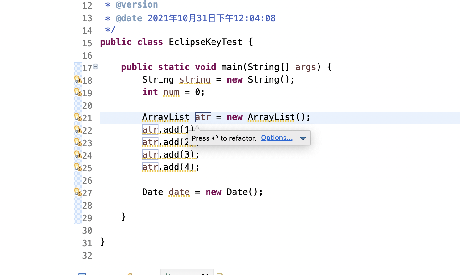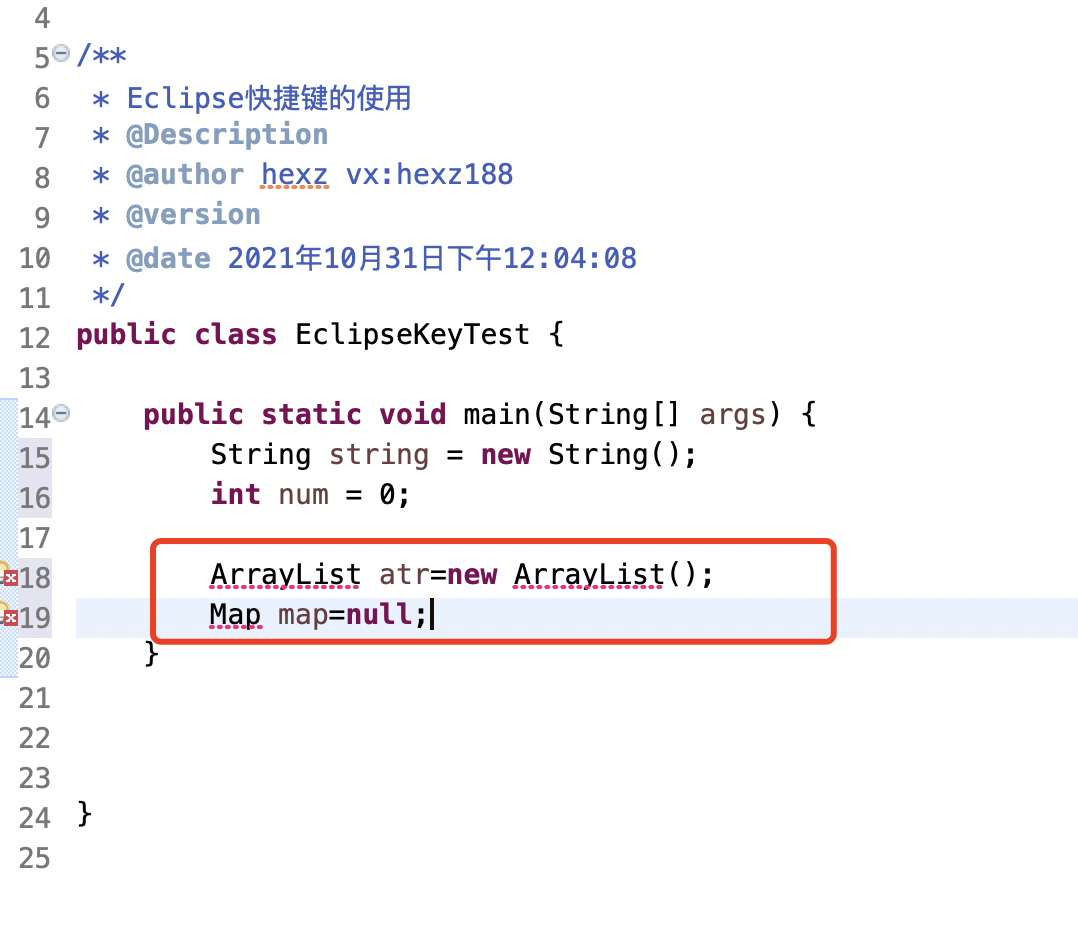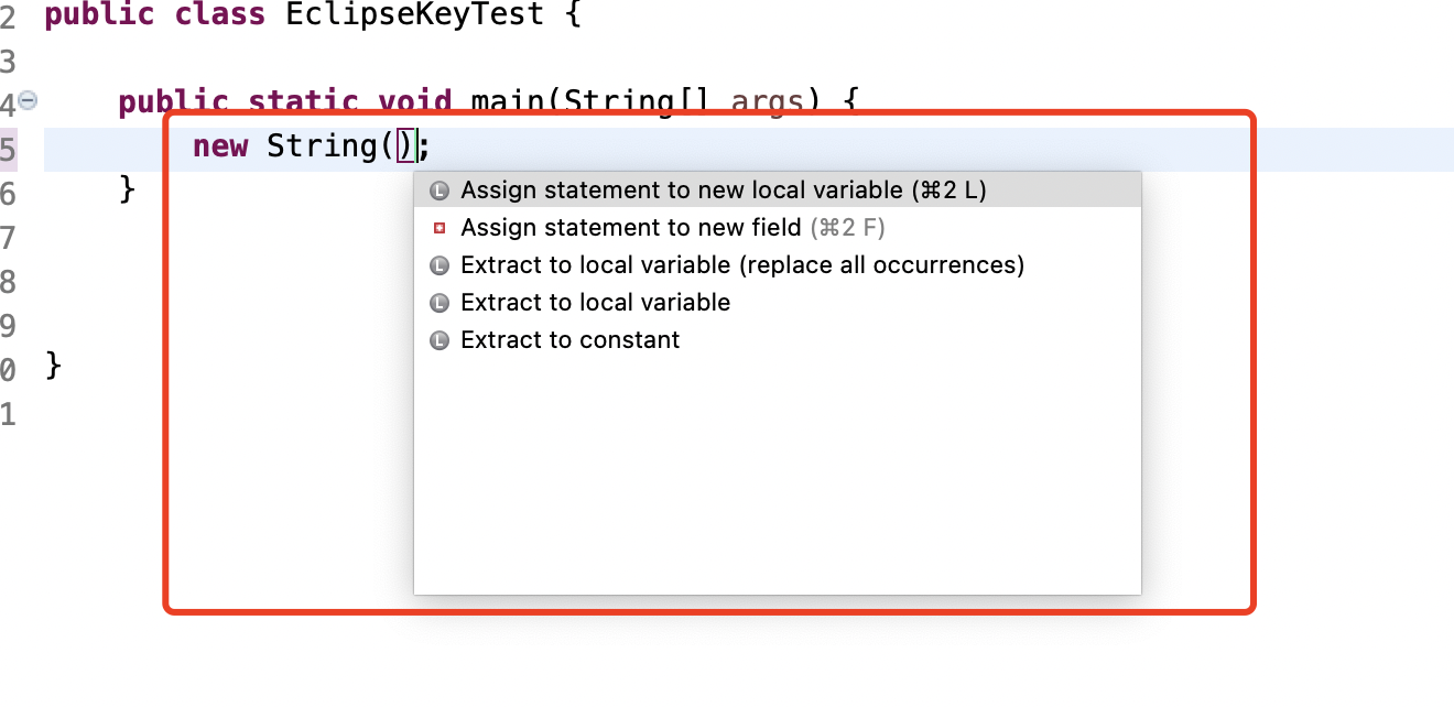 当我们创建对象时, 我们直接进入新闻, 没有提供新的对象变量名称, 我们可以很容易地将光标置于( ) 和( ) 之间, 并使用 ctrl+1 快捷键来修正它 。