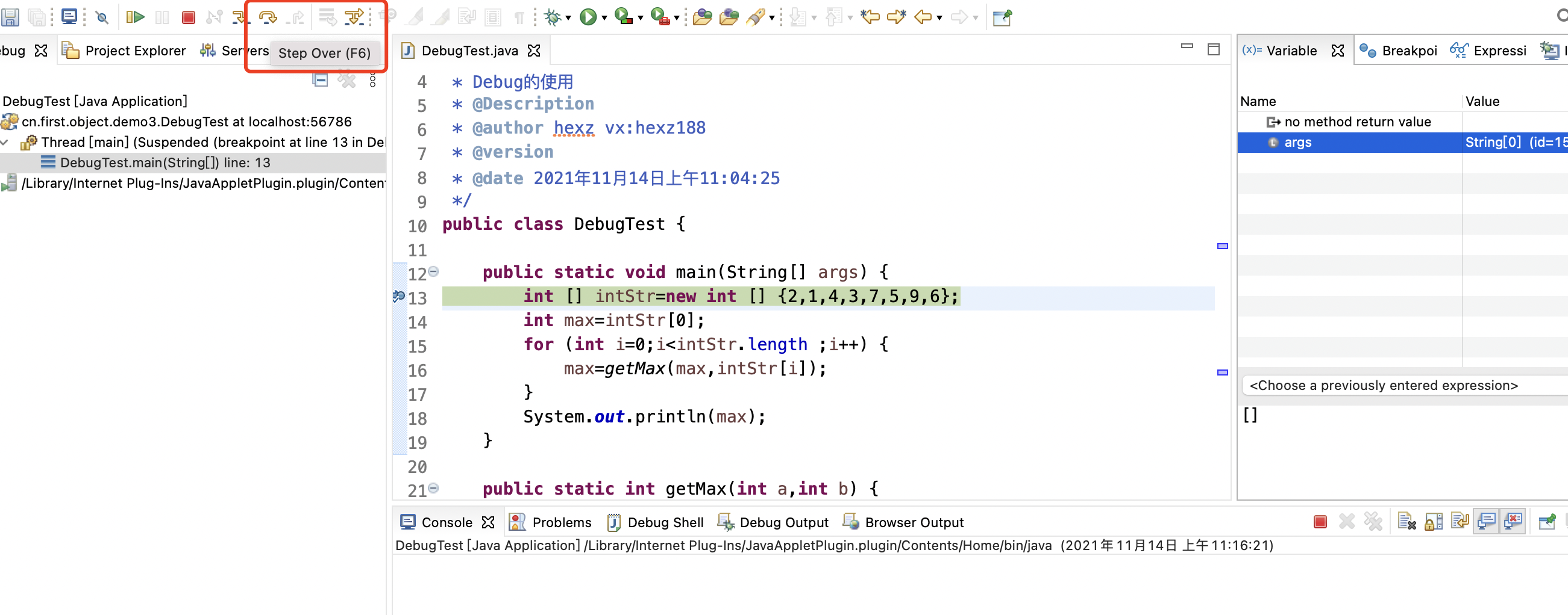 当您单击“ Step Over” 进入下一行代码时,您可以看到我们在右框中运行的变量名称和值。