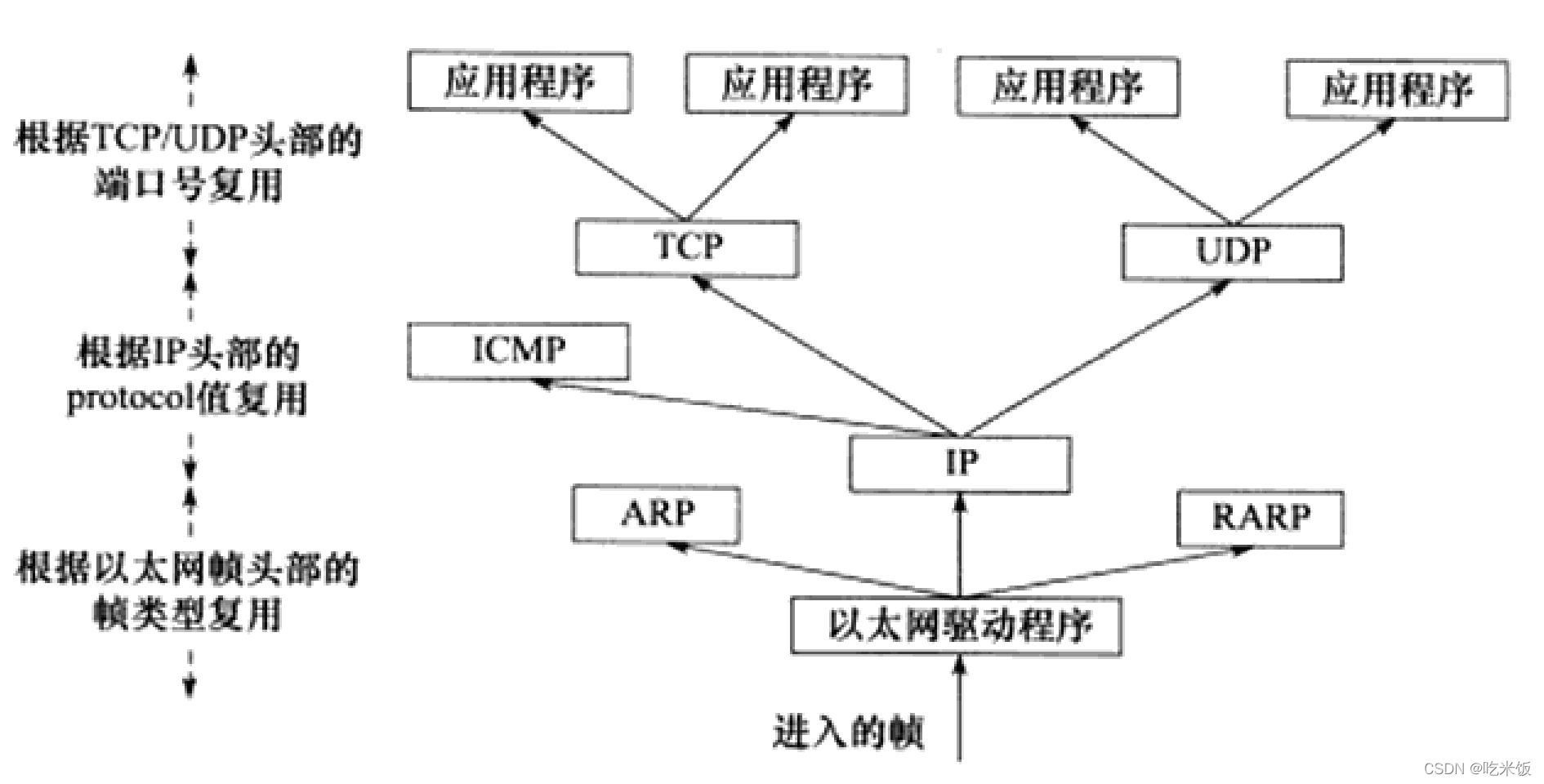 当框架到达目标主机时,它会从协议柜台向上或向下传递,每层处理它负责的框架内的主数据,以便在将处理过的框架交给目标应用程序之前收集适当的信息。这个程序被称为共享(多重翻转),通过在头部信息中使用类型字段完成分配。