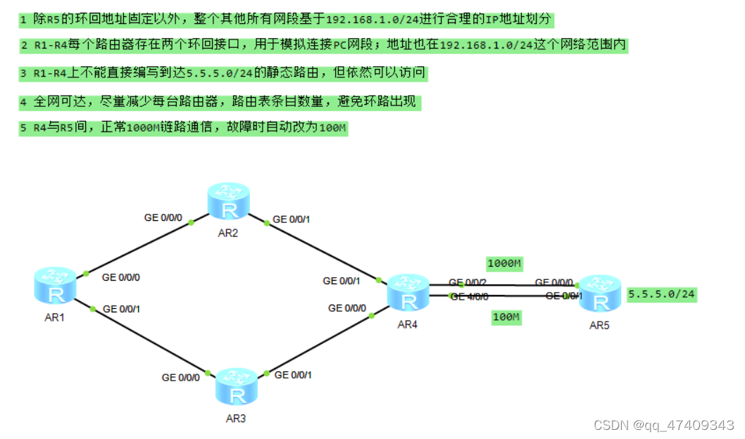 4个路由器(不包括R5),每个路由器有一个网络域,用于两个环界面;