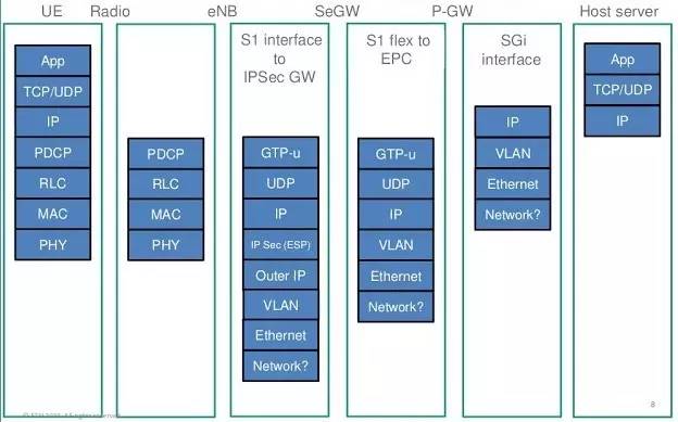这种端对端的用户面结构需要一连串协议,以“连接”层、封条和清除GTP隧道,进行IPSec加密、ROHC压缩等,所有这些都增加了传输延迟和处理费用。