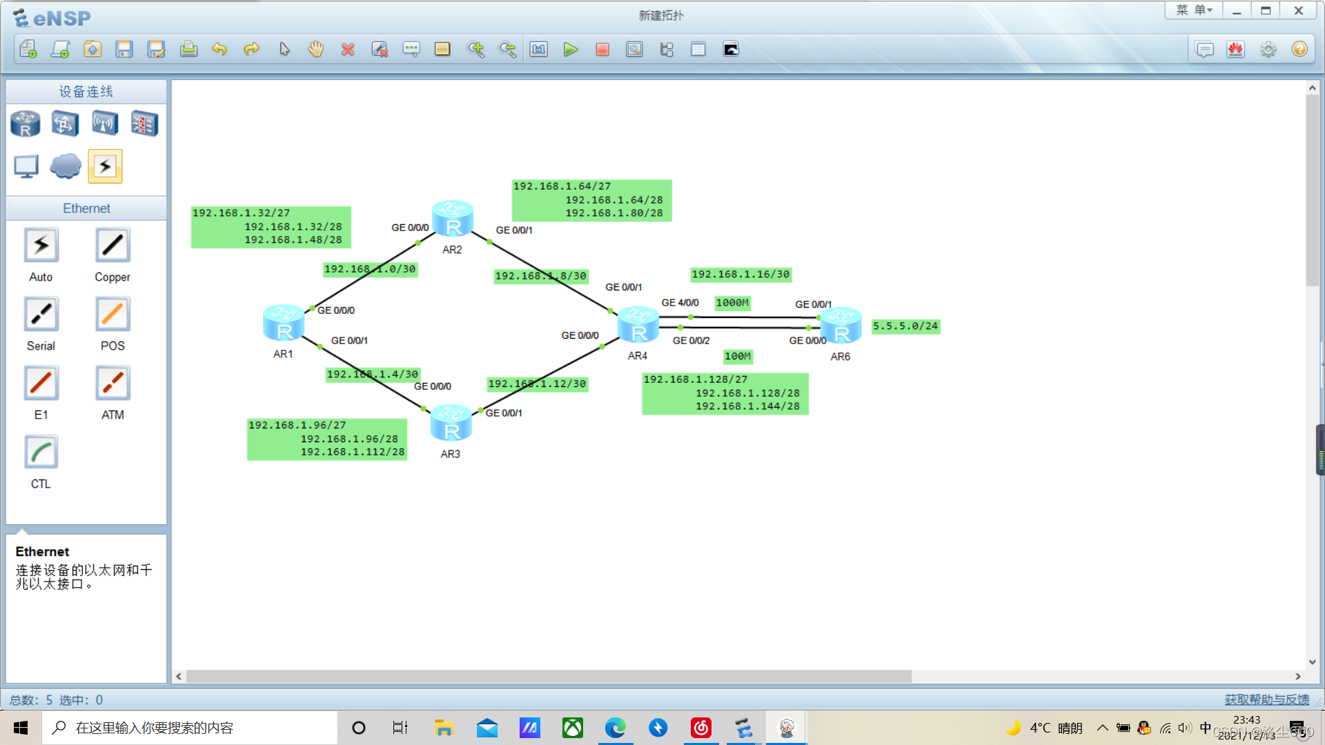 4个全网络网络,减少每个路由器路由器路由器的数量、路线图条目,避免5个R4和R5环,典型的1 00M连接,如果失败,自动转换为100M