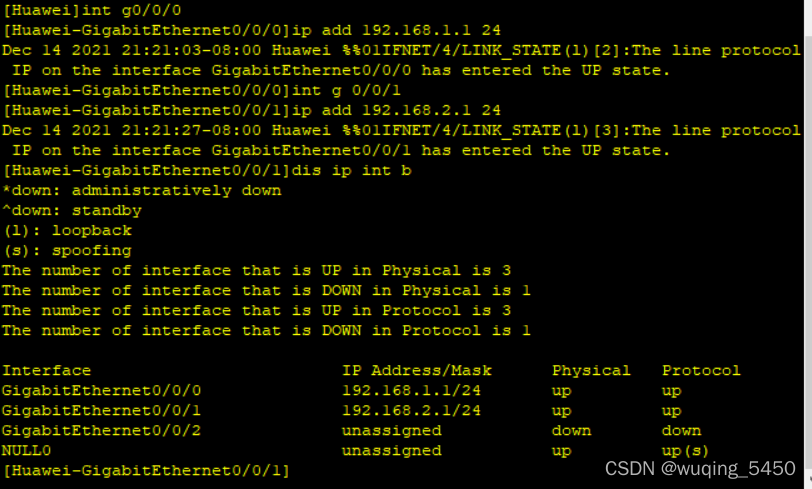 [r1-GigabitEthernet0/0/0] shutdown ---手工关闭接口