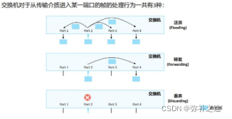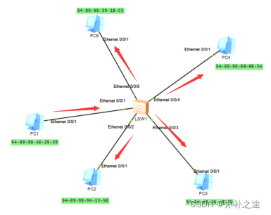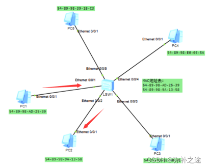 (1) 总机理由:在收到数据框架后,开关学习框架的MAC地址源地址(此处为MAC2:050-56OO-002)将在MAC地址列表上核实,并从相关端口转发。