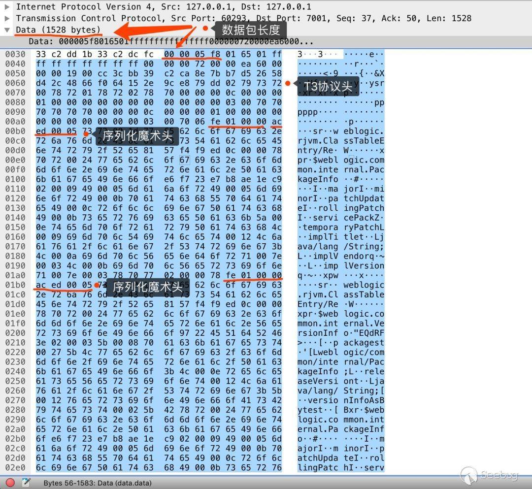 在援引WebLogic RMI时,T3协议之后的数据包握手握手。它有许多串联的魔法头(0xx0xx00x05)每个序列数据包从相同的二进制字符串( 0xfe 0x01 0x00x00) 开始 。每个数据包都包含一个 T3 协议页眉。前四个字节代表软件包的长度。