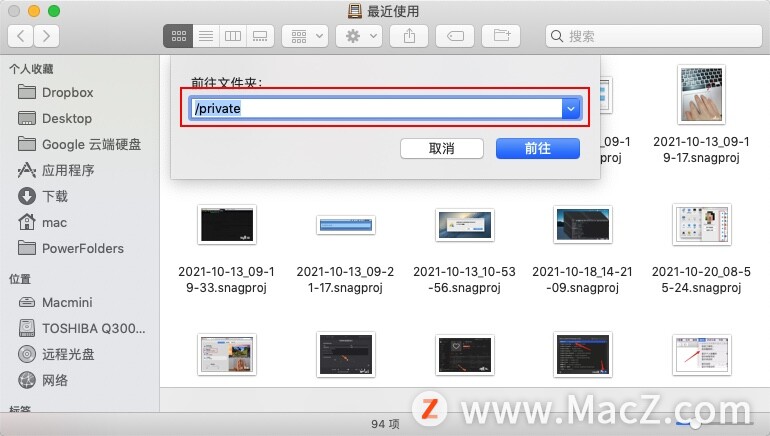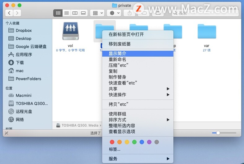 4. 右键点击开放的 Priivat 文件夹中的“ etc” 文件夹,然后选择显示配置文件;