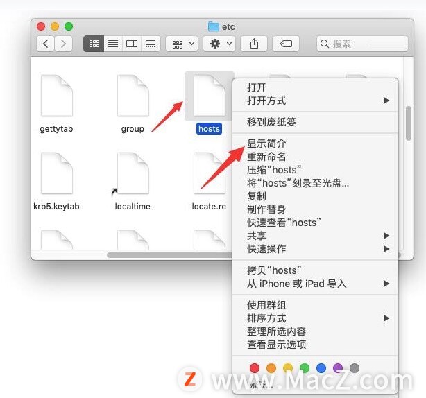 7. 打开等文件夹,右键单击“主机”文件,并选择“显示配置文件”;