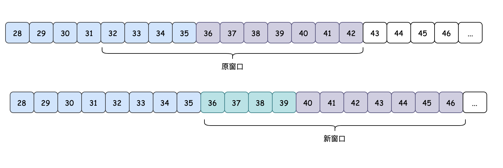 正如你可以看到的,窗口的大小是一样的。唯一的区别是接收方收到或收到。要么未接收,你没有足够空间 如果你不能拿它。发件人怎么知道目前接收端还剩多少空间?实际上,在ACK, 接收器选择自己的窗口大小。因此,发送者知道接收端窗口的大小。以上图为例,当接收者收到32-35的数据时,ACK=36 通知发件人,同时,接收端的幻灯片窗口向后滑动四位元。发件人收到ACK=36后,我被告知,数据接收器在36年前收到的数据。因此,发件人的窗口同样向后移四位数。