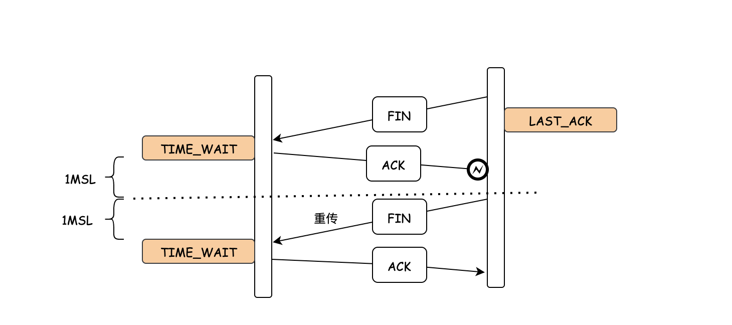如果主动断开的 ACK 未到达右侧, 则导致断开的侧面重新发送 FIN 软件包, 而另一个 MSL 则保证再传送的 FIN 软件包到达右侧 。