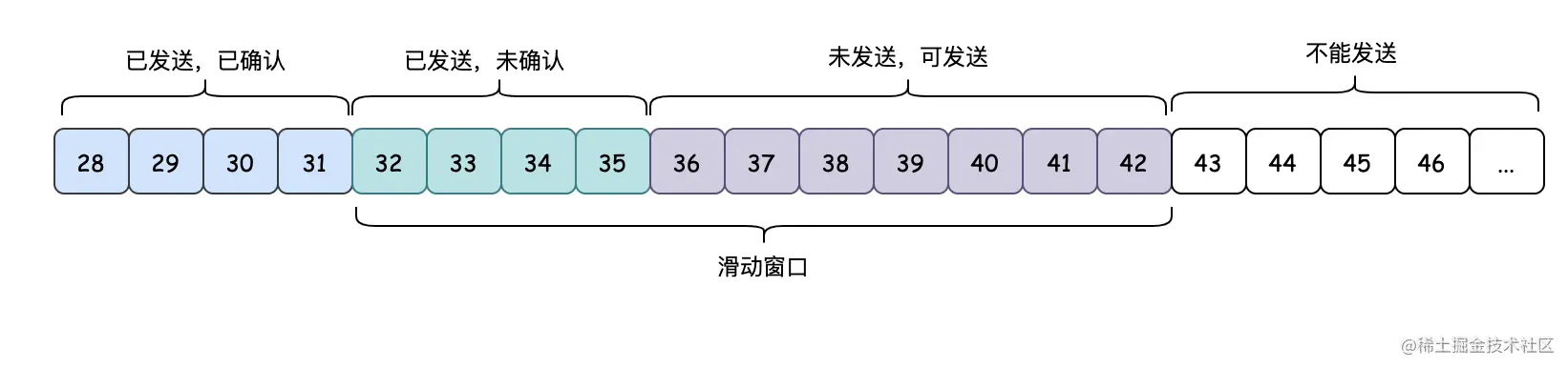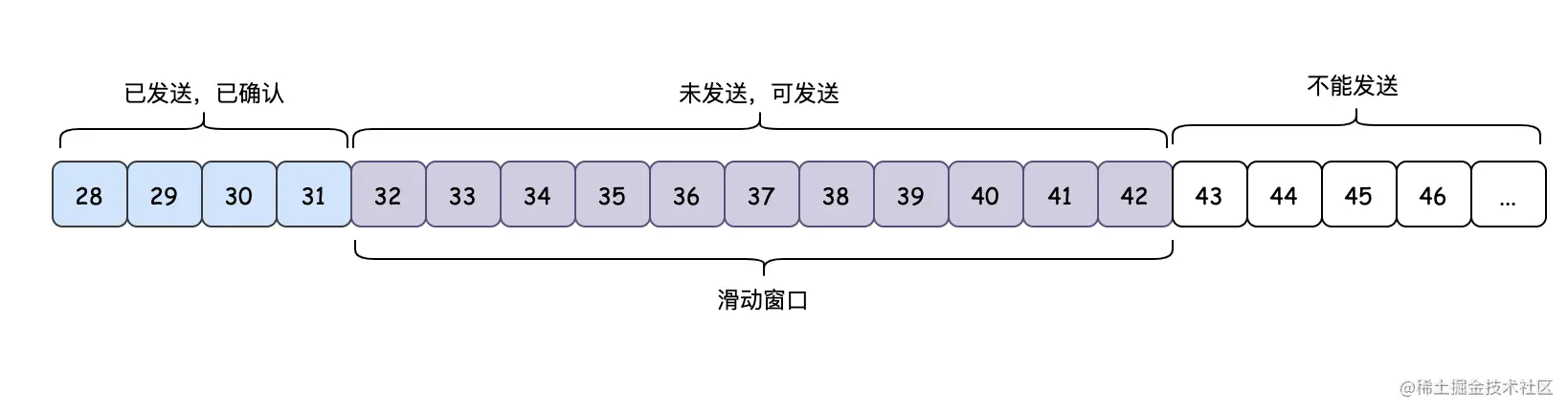 这是发件人尾端所看到的包件的状况。其幻灯片窗口组件可被视为发件人端的幻灯片窗口。关于已发送的文本中已确认的部分,算是过去时了,幻灯片窗口仅移动到右边。“未经证实的待发”和“不可发送”部分对幻灯片窗口的大小影响最大。其余的“无法发送”是因为接收端没有空间。我们会在接收端 观察一个幻灯片窗口的长相