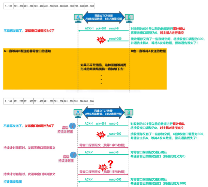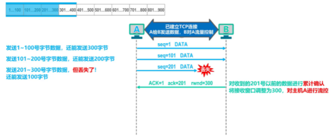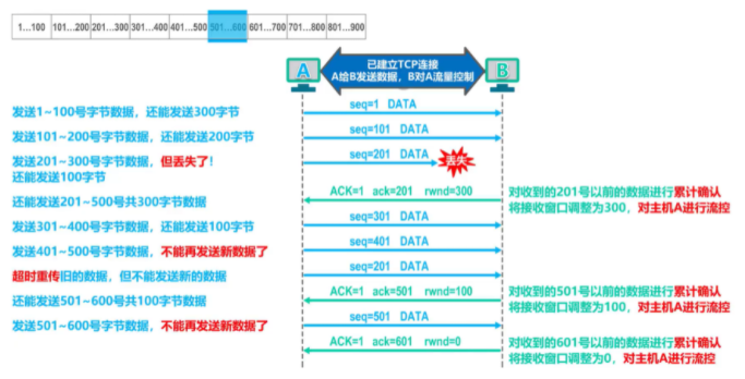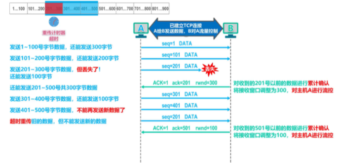 上图主机A,从窗口内部序列号 201 300 中传输100 字节数据的计时器 已经没有时间了一个主机将它们重新封印成TCP文本,并发送它们。目前无法传输补充数据 。在主机B收到转送的TCP案文后,他答复如下:在主机A 转发501之前,对数据进行了累计验证。并在该累计确认中,将窗口字段的值设为 100 。这是主机B对主机A流量的第二个控制器