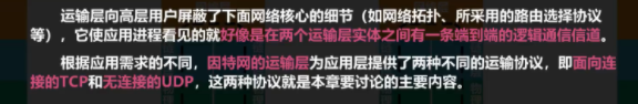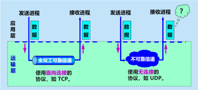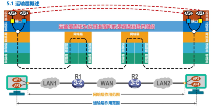 “逻辑通信”一词是指运输层之间的通信,似乎沿水平线传输数据,但这两个数据在水平方向上没有物理联系,所要传送的数据沿着图中上下各条虚线。