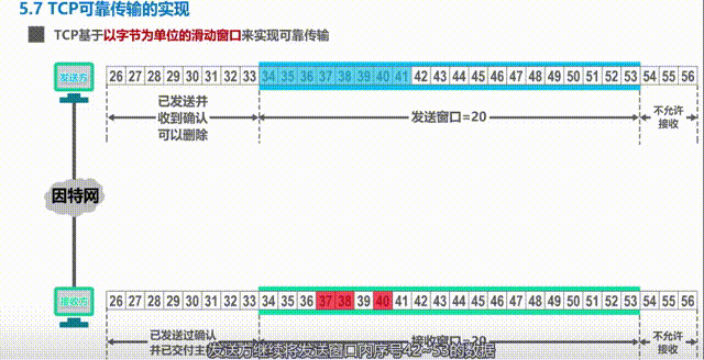 现在,假设接收方收到一些进一步的数据报告,它们封装有37,38和40是数据。虽然这些数据的序号可在接收窗口中发现,但并不公开。然而,它们都是未按顺序排列的数据。目前,只有收据缓存可以存在。(接收方只能按顺序以收到的最高序列号对数据进行验证。)因此,收款人确认报告上的确认号仍为34号!),假定接收方发送的事先确认电文送达发件人,发送方接收后,发送窗口前移三个序列位数。传送窗口的大小保持不变 。结果,51-53人落入发件人窗口(TCP通信是连续通信)。序列号3133 离开传输窗口。数据 31-33 现在可以从传输缓存中删除 。接收准则已经核实。