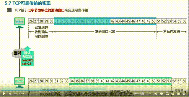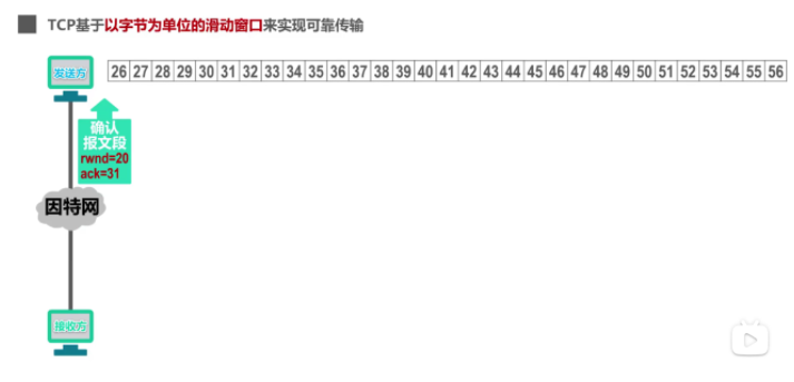 接收方指定接收窗口的大小为20字节,确认号为31,确认号字段为31,表示接收方希望收到下列序列号为31的数据,并成功收到最多为30个的数据。
