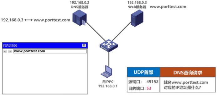 第一个 UDP 中的目标端口编号53 具体规定, UDP 用户数据报告或 DNS 查询请求中的数据负荷部分应提供给此服务器的 DNS 服务器进程 。