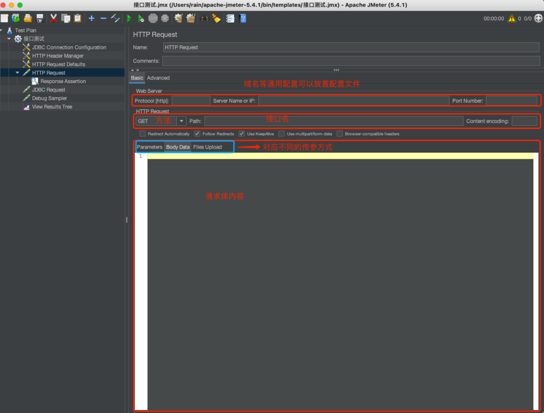Jameter HTTP请求组件的布局可见。这都是关于变数, 和所有变数, 它所有关于变数, 它所有关于变数, 它所有关于变数, 它所有关于变数, 它所有关于变量被归类为全球或本地变量;例如,请求方法、界面名称、请求内容和域名。一般而言,域名在一个项目中基本固定。这可以被设定为全球变量 。放到配置文件中。HTTP 请求是一个可本地设置的变量 。作用于HTTP。这是我们必须纳入我们的个案手册的内容。