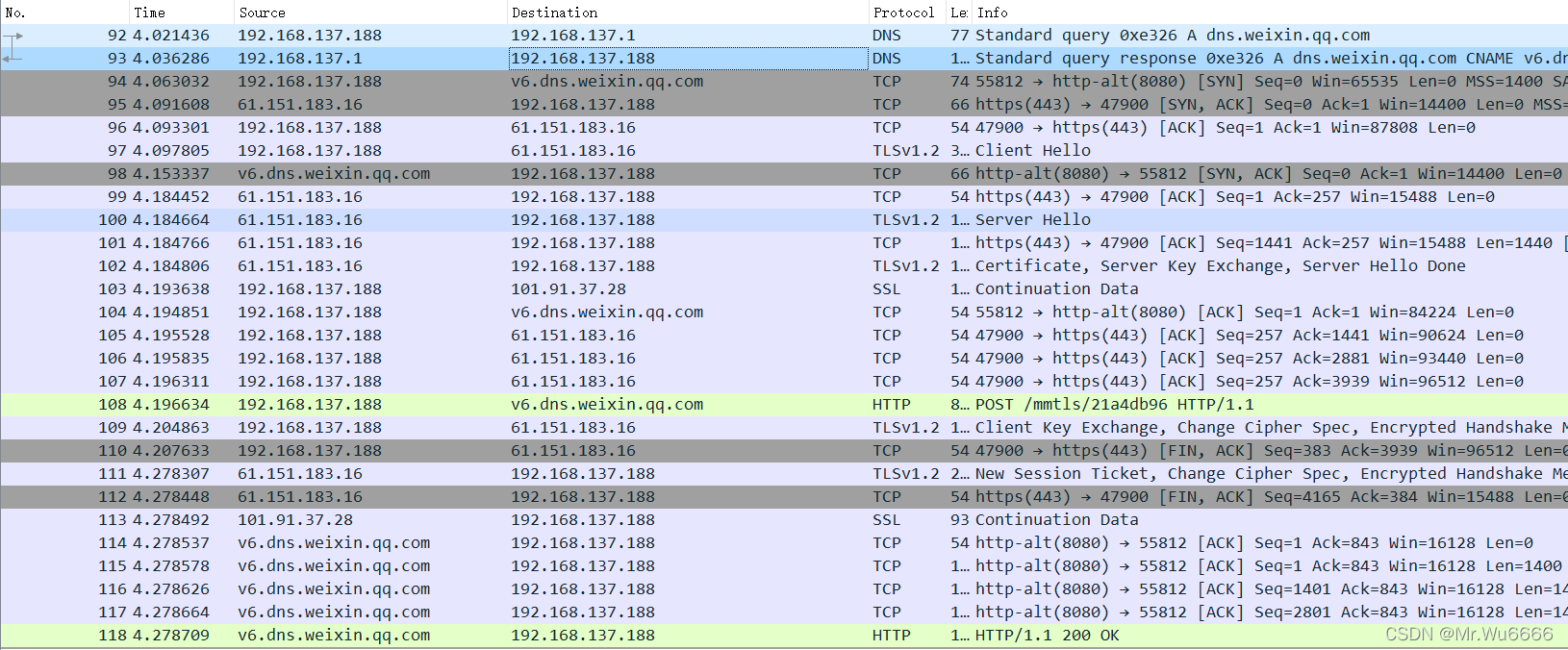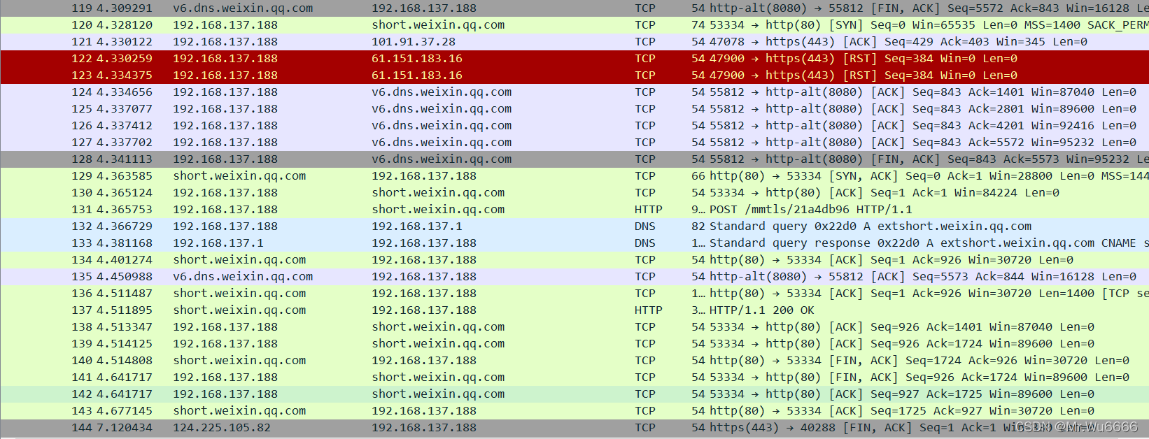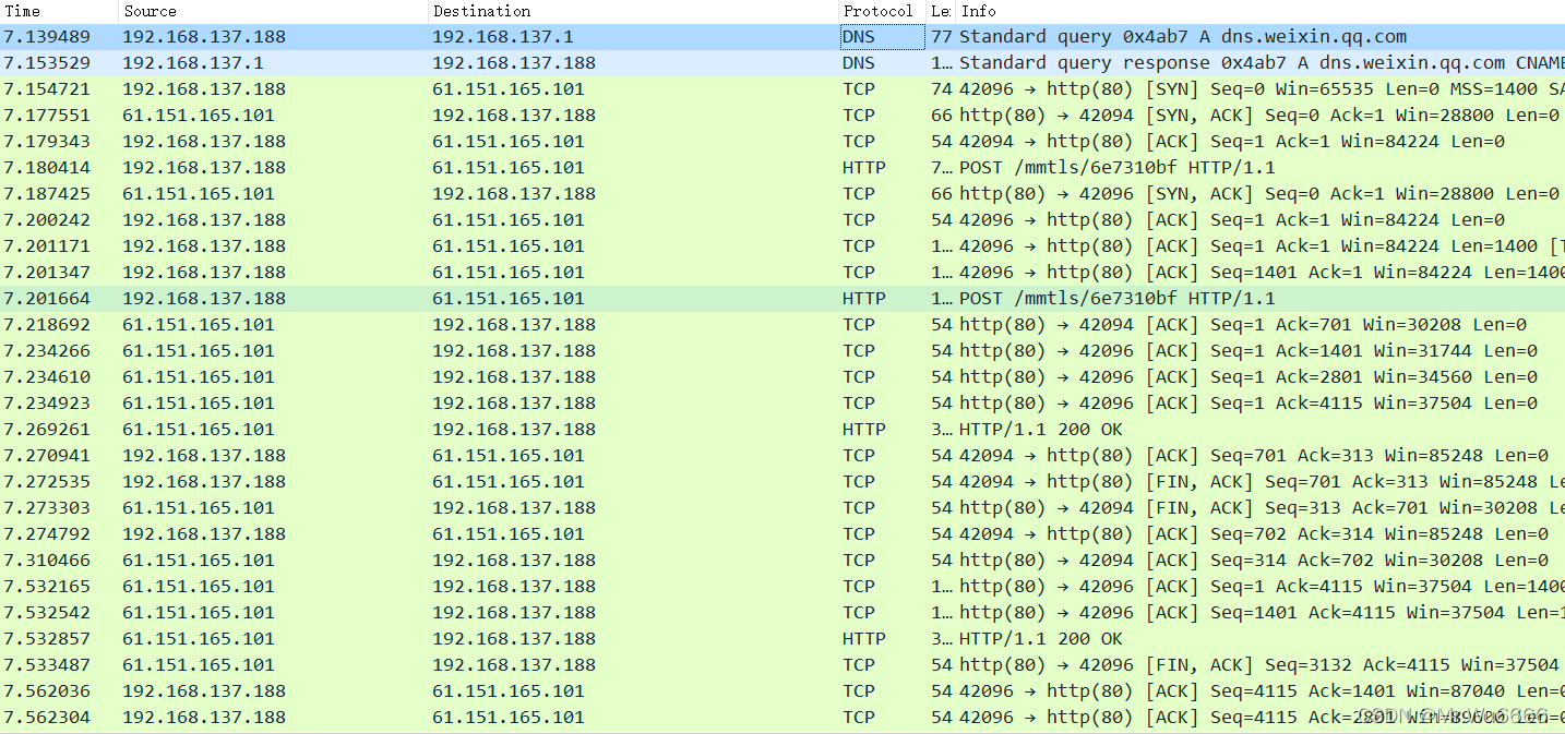 客户首先发送 DNS 请求 。DNS 服务器然后提供回复 。来听听吧 Weixin 我不知道qqCom的pip地址是什么然后握了三次手 以巩固债券。这是我第一次收到朋友的留言它包含来自朋友界面圈的信息 。并且在传输结束后,在tcp断开上,有四个握手。我很久没明白我在说什么了最终结束连接。