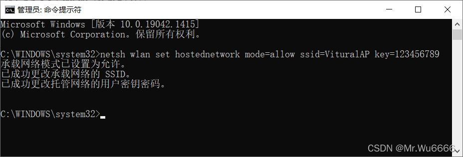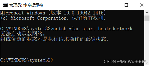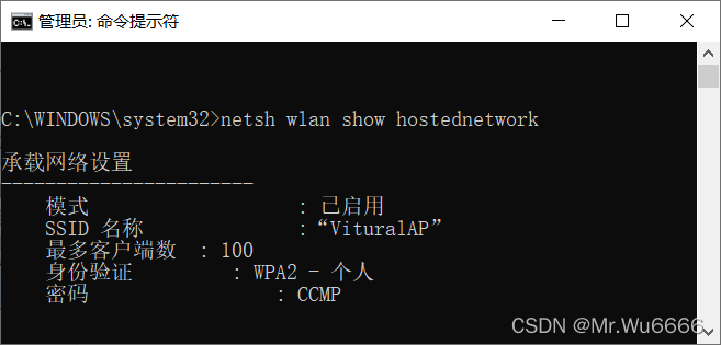 作为管理员执行以下命令: Netsh wlan 设置主机网络模式= Allow ssid = VituralAP key=123456789可以更改设置 。然后,设置共享互联网连接。最后,开启无线网络,netsh wlan 显示主机网络在命令提示中仍然在运行 。