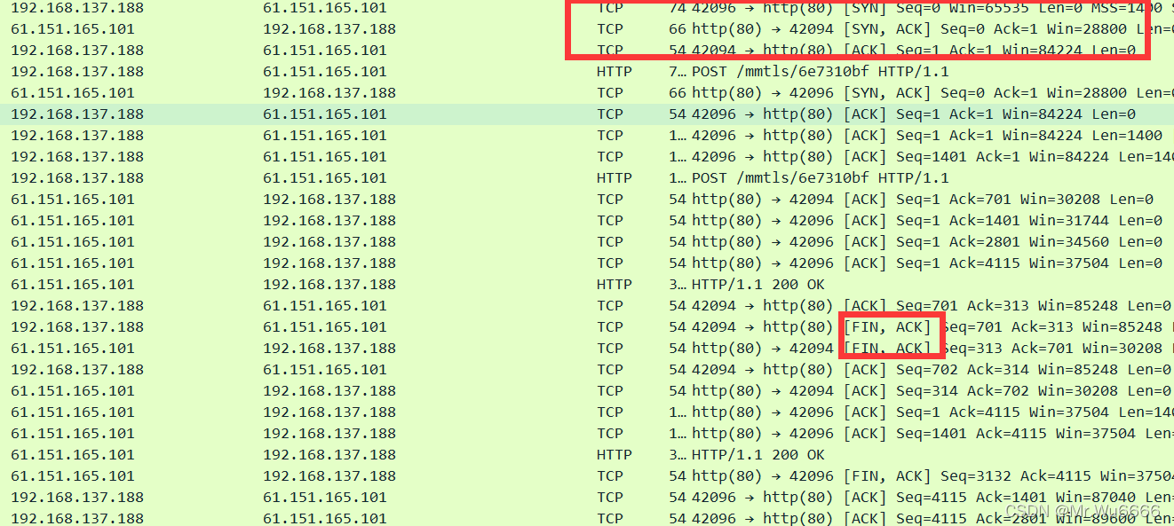 (3) 如果 tcp 无法连接,需要进行四次握手,标志位是FIN,应检测到四个数据集。但我试了好几次,然而,实际上只获得了三个数据包。查了相关资料,这是因为服务器将数据传送回客户端。两个包裹一连串混在一起。