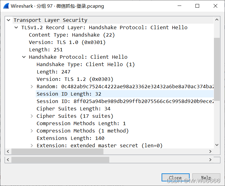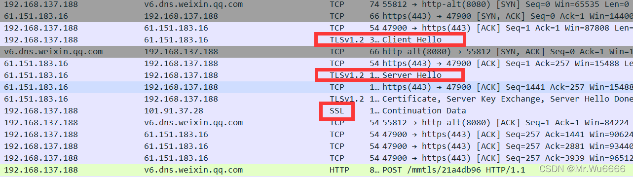 通过分析可知,在进行微信聊天时,第一步是握手三次然后,通过SSL/TLS密码协议传输数据完整性和安全性数据要向服务器发送信息, TLS 协议包之一包含客户端给服务器客户端的问候信息 。要在客户端和服务器之间建立连接,数据使用TCP协议发送。在整个电文分发过程中,使用SSL对电文进行加密。