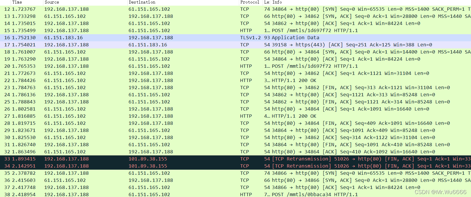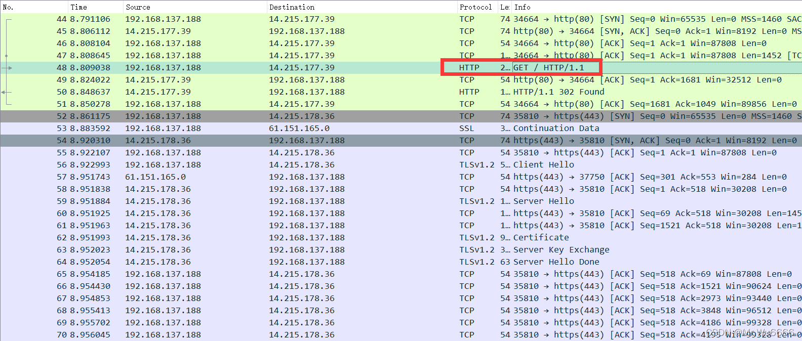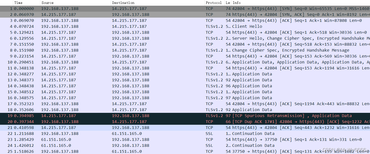 然后, 举起三个拇指前三个包是在进行 第一次握手 在tcp三步握手认证。TCP是由客户发送的。SYN=1是标志。第二次握手,服务器向客户端发送数据包 。SYN=1,ACK=1,将识别序列号设为后加1加上客户的序列号。即第三次握手,0+1=1。客户从服务器收到软件包后确认序列号。这是最初的顺序加一个如果招牌上的背包是1呢?若正确,客户端将向服务器发送另一个数据包 。SYN=0,ACK=1,确认序号=1,此外,将服务器的序列号加1 传送到ACK。发送一个序列序列的序列序列。收到序列号后,客户用ACK=1进行验证。代表客户提出联系请求;