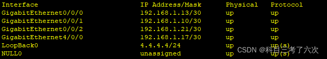 [r4-GigabitEthernet0/0/0]ip a 192.168.1.13 30