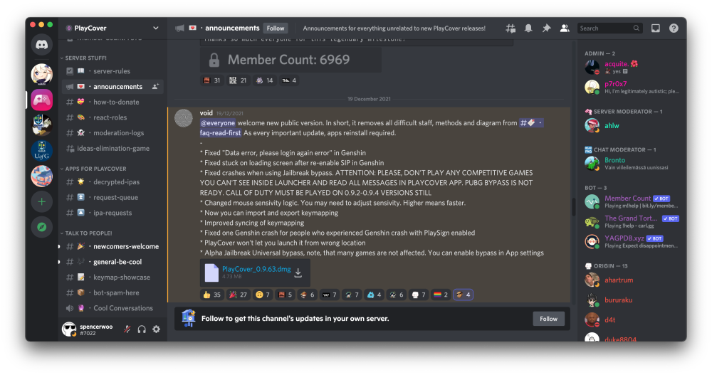 目前最新的 PlayCover 版本是 ,加入官方 Discord 之后可以看到开发者在#announcements 频道发布的更新信息,点击附件下载安装即可。