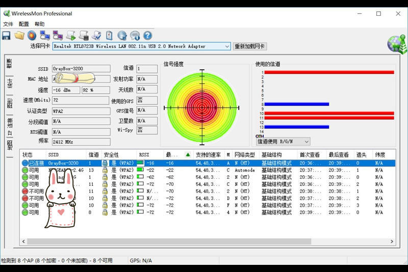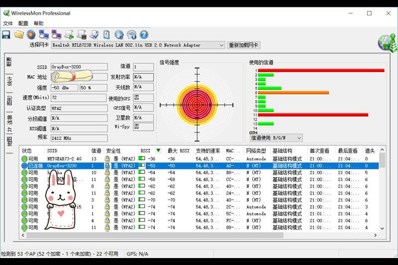 测试前先介绍一下网络布局环境,路由器放在书房,两个测试点分别为书房电脑桌和客厅玄关,客厅玄关距离路由器8-9米,隔两堵墙。电脑端测试软件为WirelessMon Professional,手机端测试软件为花瓣测速,SSID:OrayBox-3200,手机、笔记本2.4G无线连接路由器。
