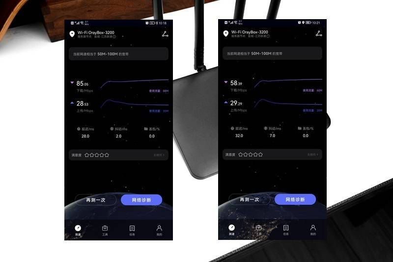手机测速,书房,下载速度约85Mbps/s,上传速度约28Mbps/s,延迟28ms,丢包0;客厅,下载速度约58Mbps/s,上传速度约29Mbps/s,延迟32ms,丢包0。