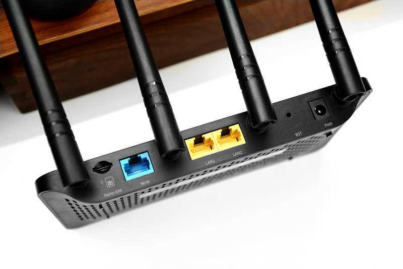 路由器配有一个蓝色WLAN接口和两个黄色LAN接口,自适应10/100 Mbps,左侧是SIM卡槽,Nano-SIM卡,右侧是重启键和电源接口。