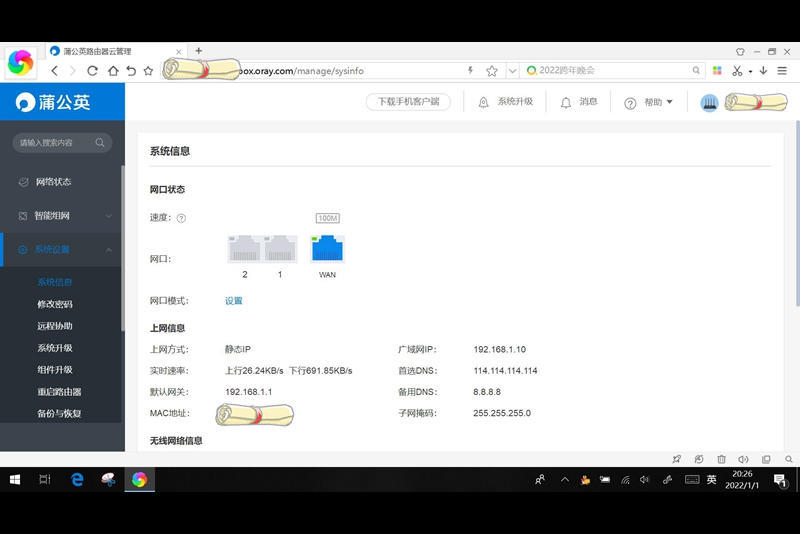 系统设置,可以查看当前网口状态、实时速率等信息,这里也可以进行系统升级和重启路由器。