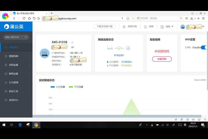 路由器支持网页和手机APP登陆设置,网页版功能更丰富一些,这里先介绍一下网页版。网络状态,可以查看广域网、局域网、MAC地址,网络当前上下行速度,智能组网以及WiFi设置状况。