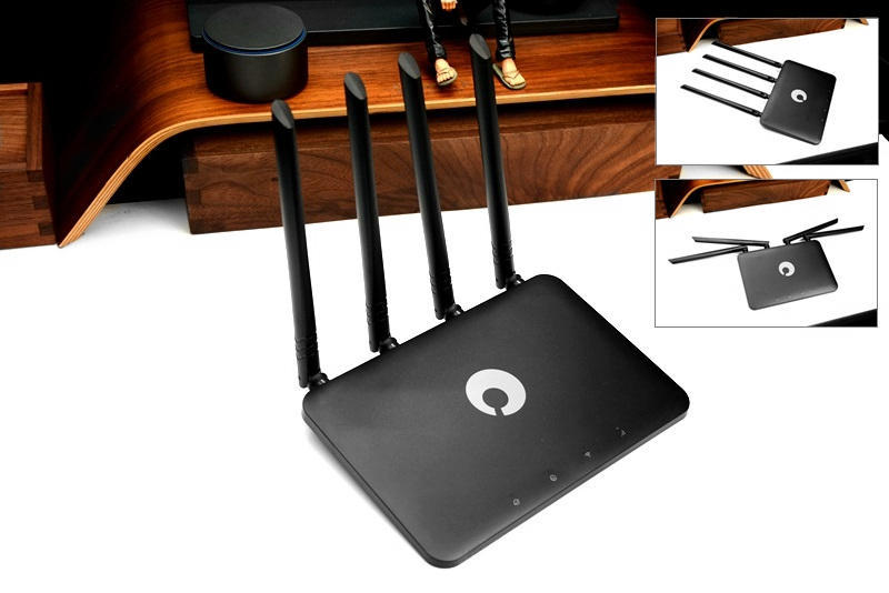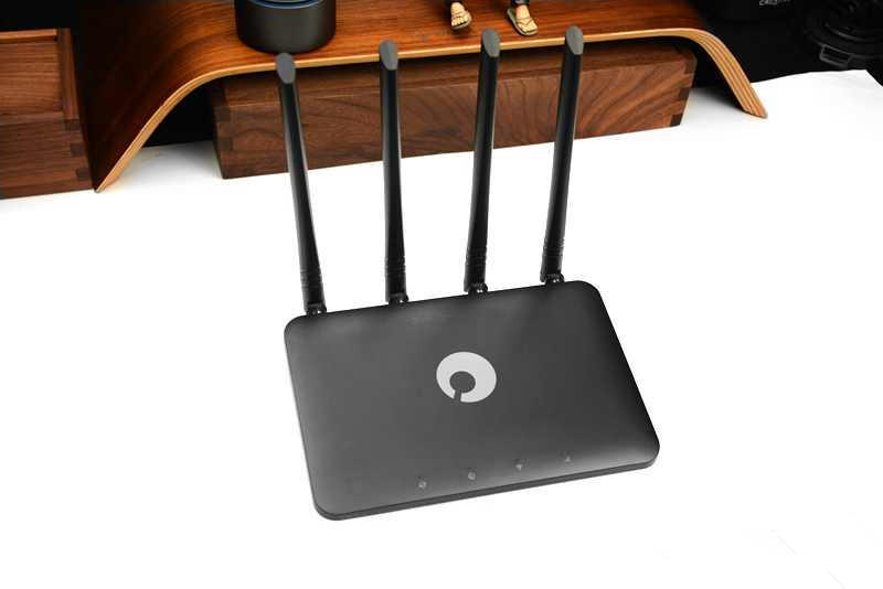 蒲公英X4C外观也挺素的,路由器通体黑色,正面也是一个蒲公英LOGO。路由器尺寸中等,超薄设计,后部配有4根增益天线,两根4G天线,两根2.4G WiFi天线。