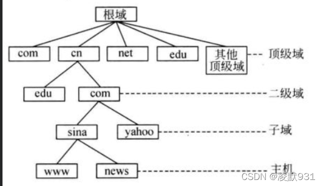 DNS实际上是一个分布式,层次结构的数据库系统,DNS并没有保存着所有主机信息的主机表,信息存放在许多分布式的域名服务器中,这些域名服务器组成一个层次结构的系统,顶层是一个根域(root domain),使用符号"."来表示。根域的下一层为顶级域,又称为一级域。其下层为二级域,再下层为级域的子域,按照需要进行规划,可以为多级。所以对域名空间整体划分,都最顶层到下层,可以分为:根域、顶级域、二级域、子域。每个域都有一组域名服务器,这些服务器中保存着当前域的主机信息和子域的域名服务器信息。例如:根域服务器不必知道根域内所有主机的信息,只需知道下一级子域的域名服务器的地址。因此,在分布式的域名服务器体系中,每一台域名服务器负责解析属于自己的这一部分主机。