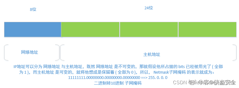 1是网络位,0.0.0是主机位,A类地址是大型网络,含126个网段,每个网段主机数大约允许有1670万台主机,通常分配给拥有大量主机的网络(如主干网)