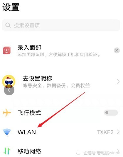 第二步:打开手机设置,找到无线网WLAN点击进入;