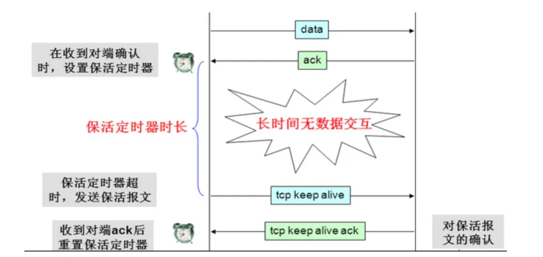 这时候TCP协议提出一个办法,当客户端端等待超过一定时间后自动给服务端发送一个空的报文,如果对方回复了这个报文证明连接还存活着,如果对方没有报文返回且进行了多次尝试都是一样,那么就认为连接已经丢失,客户端就没必要继续保持连接了。如果没有这种机制就会有很多空闲的连接占用着系统资源。原理如下图: