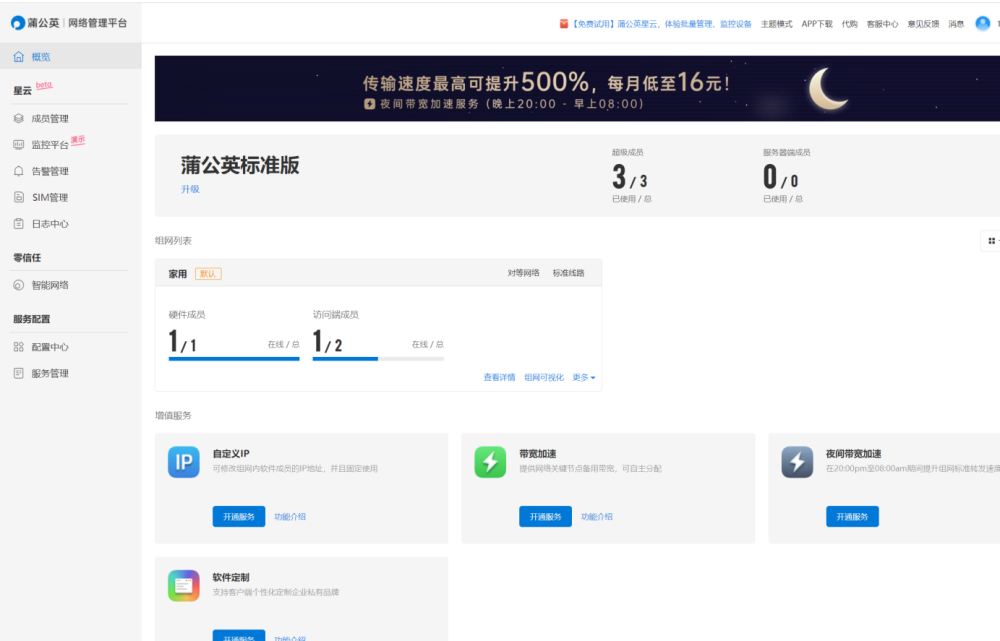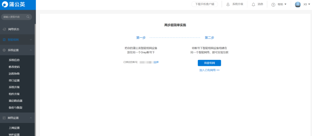 接着就会弹出组网提示,绑定Oray帐号,然后将帐号下智能组网设备组建在同一个智能网络,就能实现互联了。点我要组网就进入了蒲公英云管理平台,接着选择创建网络,命名网络。