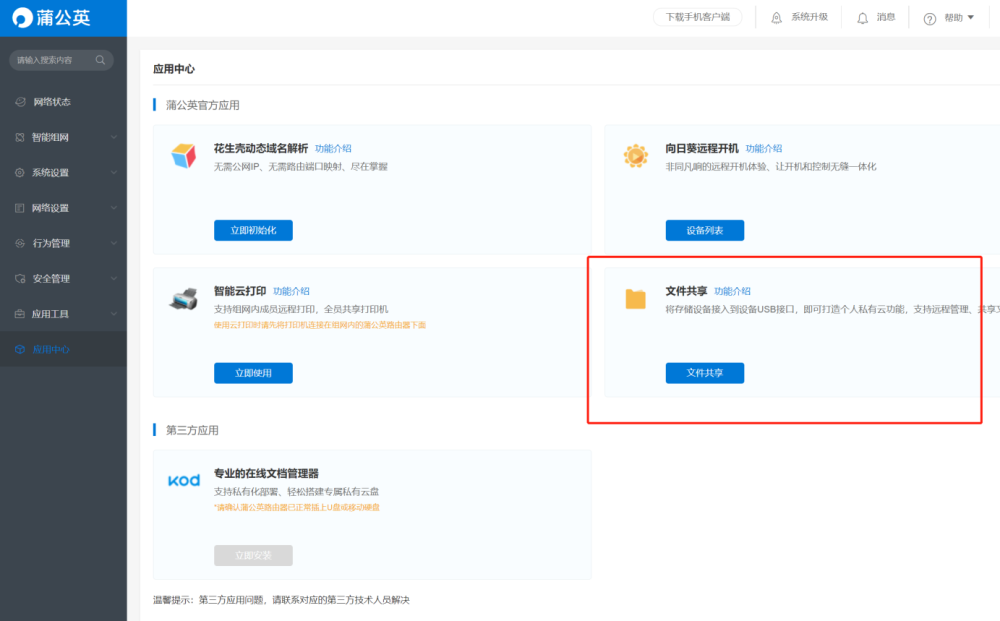 前面咱接入了U盘了,也完成组网了,在路由器后台的应用中心找到文件共享,打开共享开关,就实现了移动硬盘变NAS云盘的功能。