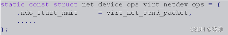 网络设备方法操作集,该数据结构定义了针对当前设备的一组操作集合,比如ndo_open、ndo_stop和ndo_start_xmit等。