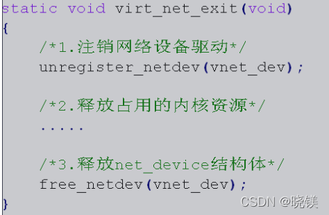 int unregister_netdev(struct net_device *dev)注销设备驱动,释放占用的系统资源。