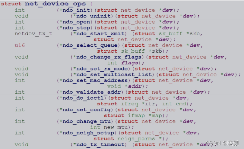 从不同的硬件设备中提取具有共性的东西进行统一描述和操作,形成了net_device_ops设备方法,以下是linux中该结构体的部分成员: