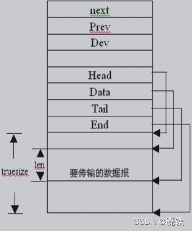 unsigned char *head, *data; head指向已分配空间的头,end指向尾,这俩值是不变的;data和tail由模块根据需要进行修改,如图: