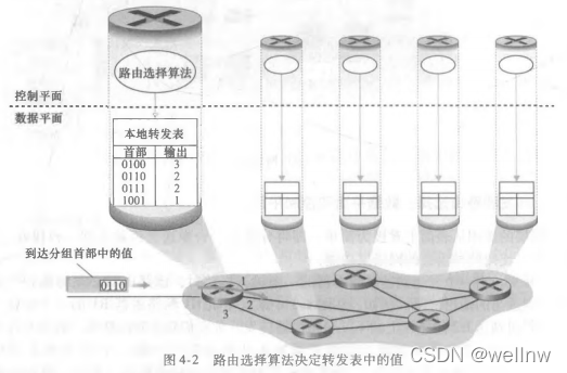转发:当一个分组到达某路由器的一条输入链路时,该路由器必须将该分组移动到适当的输出链路转发是在数据平面中实现的唯一功能,在最为常见的场合,分组也可能被现有的路由器阻挡(如该分组来源于一个已知的恶意主机,或者该分组发向一个被禁止的目的主机),或者可能时冗余的并经过多条出链路发送。转发(forwarding)是指将分组从一个输入链路接口转义到适当的输出链路接口的路由器本地动作。转发发生的时间尺度很短(通常为几纳秒),因此通常用硬件来实现。转发是由网络层的数据平面执行的主要功能。
